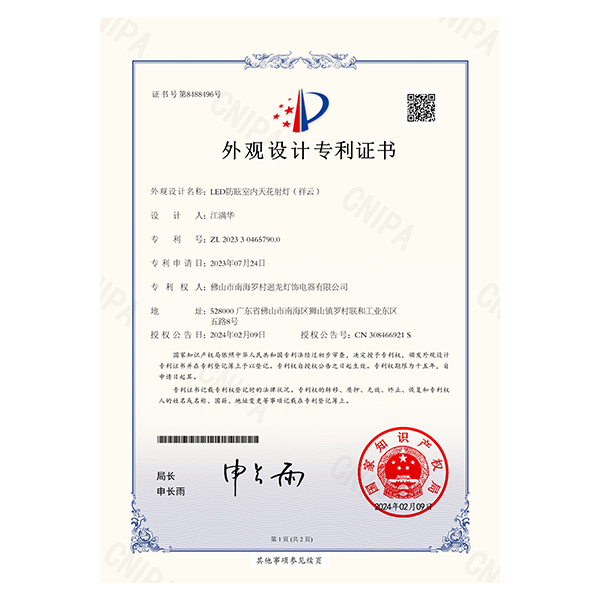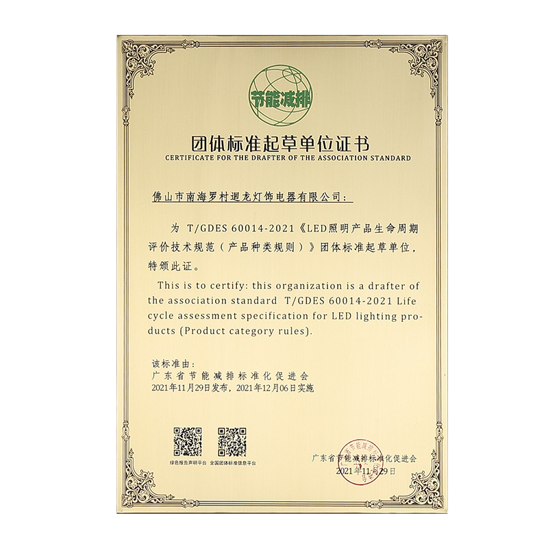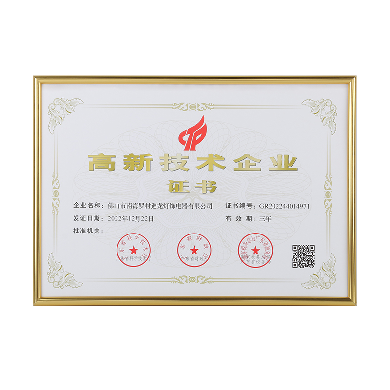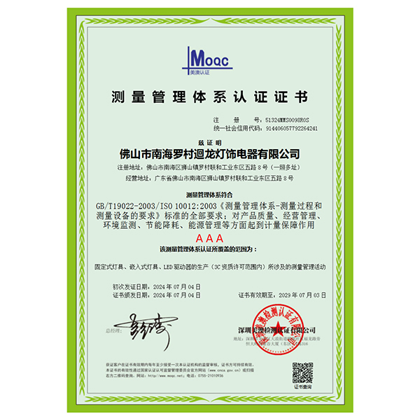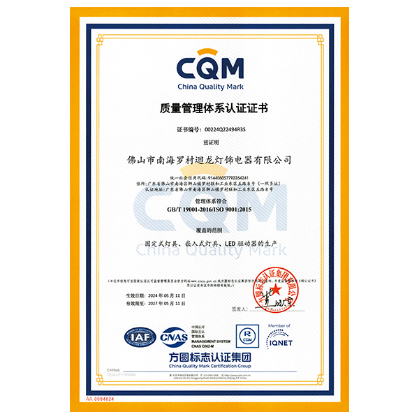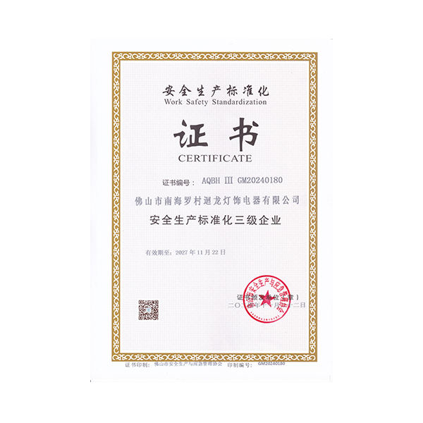 迴龍燈飾通過ISO9001國際質(zhì)量體系認(rèn)證,2010年被《環(huán)球市場》評定為GMC中國優(yōu)質(zhì)制造商,先后加入了南海照明協(xié)會、CSA國家半導(dǎo)體照明工程產(chǎn)業(yè)聯(lián)盟、廣東省照明學(xué)會等,產(chǎn)品通過CCC、CQC、CE等認(rèn)證。